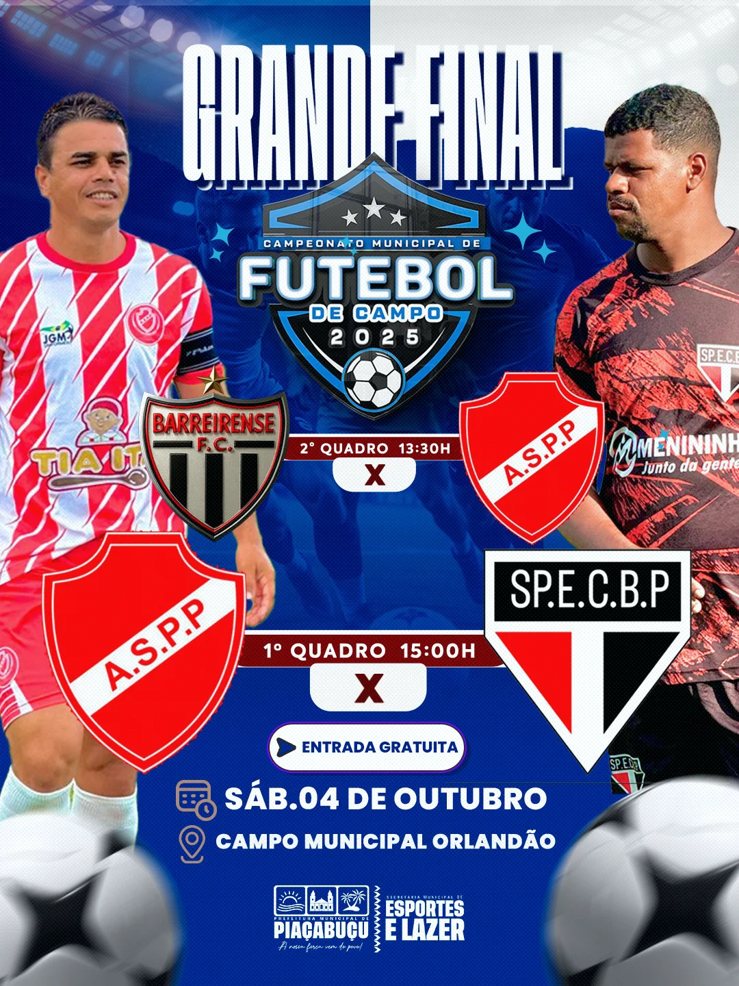 A partir das 13h30, o público acompanha a disputa do 2º quadro, entre Barreirense e ASPP. Em seguida, às 15h, acontece a aguardada decisão do 1º quadro, com um verdadeiro clássico local: ASPP x São Paulino.