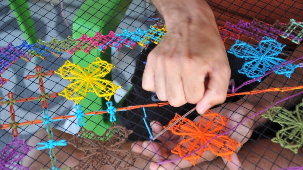 Ela explica que todo o trabalho começa na rede de pesca. Na história passada de mãe para filha, as mulheres trabalhavam para consertar as redes dos esposos, filhos, netos. Dali se viu que é possível produzir muito mais com o material. “É muito amor e paciência. Tudo começa na rede, depois vai para o tear, depois para a confecção do filé mesmo, com a montagem das peças. E ficamos muito felizes quando as pessoas passam e gostam. É tudo feito à mão mesmo”, conta a artesã.