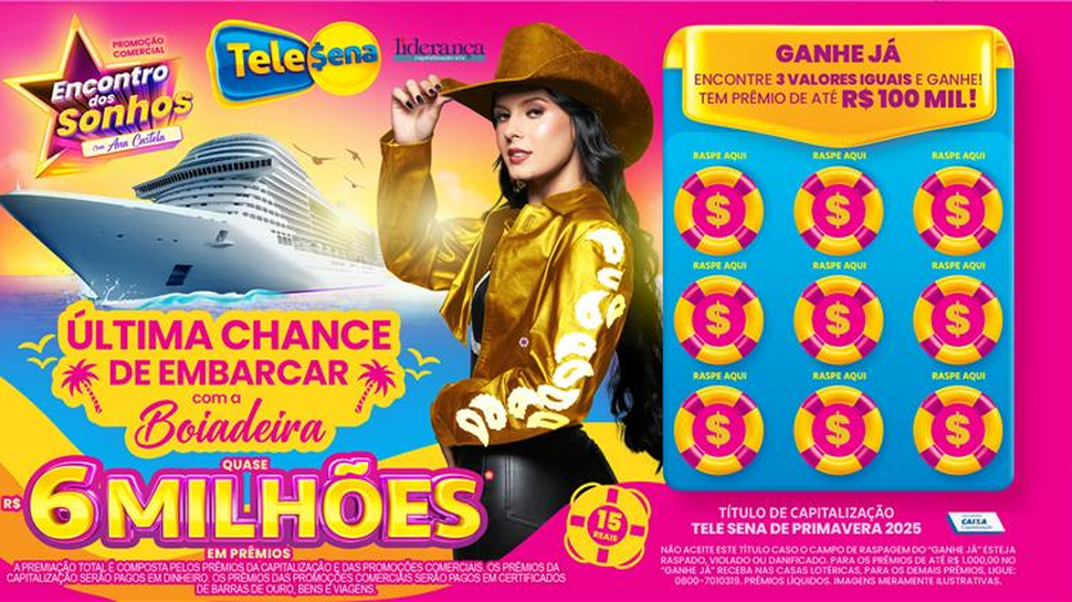 Além de todas essas oportunidades, a Tele Sena de Primavera mantém a promoção especial estrelada por Ana Castela: quem adquirir o título, se cadastrar no site ou aplicativo oficial e seguir as regras da campanha, ganha um número da sorte para concorrer a uma viagem inesquecível, com acompanhante e tudo pago para o Navio da Boiadeira. Serão cinco sortudos com acompanhantes que terão essa experiência em 2026!