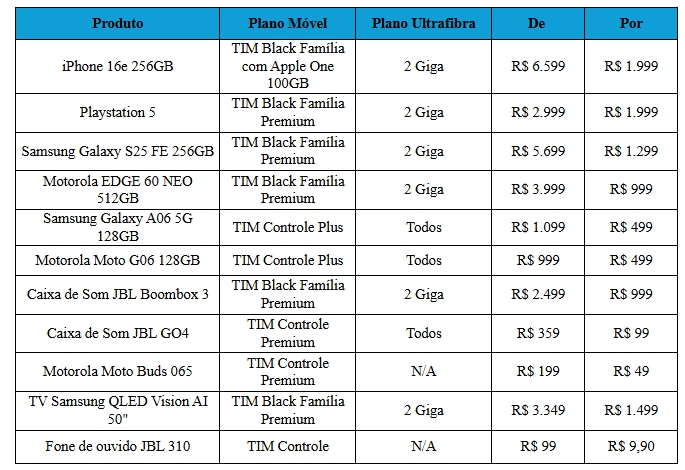 Há ainda ofertas no TIM Controle e descontos em caixas de som, TVs, fones e outros dispositivos. No pré-pago, a plataforma Recarga Premiada terá um sorteio final de R$ 100 mil. Já na TIM Ultrafibra a principal novidade é a extensão do desconto em smartphones e acessórios para clientes do serviço, que variam de acordo com o plano contratado mediante fidelização de 12 meses. Além disso, a operadora oferece um plano exclusivo de Black Friday com velocidade de 1 Giga por R$ 129,99 mensais e assinatura Globoplay inclusa.