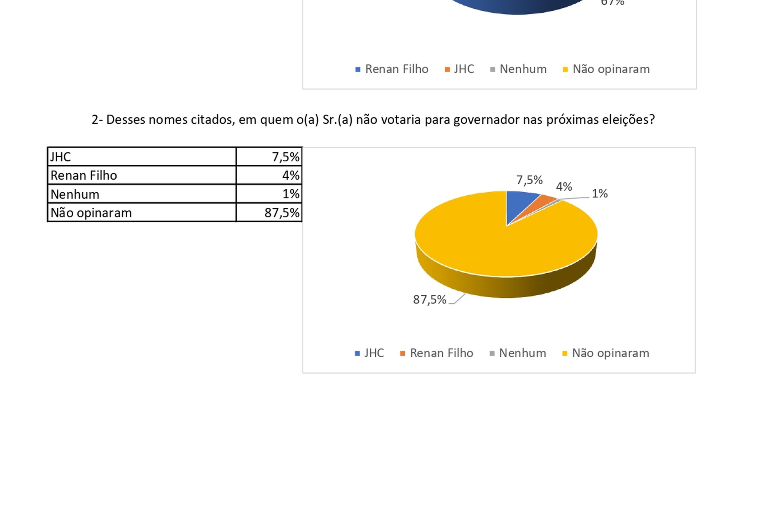 De acordo com a pesquisa, Renan Filho [que administrou o Estado por dois mandatos entre 2015 e 2022] lidera em Pariconha com 67% das intenções de voto, enquanto JHC aparece somente com 6,5%; nenhum deles aparece com 1% e outros 25,5% preferiram não opinar. No quesito rejeição, JHC tem 7,5% e Renan Filho soma 4%.