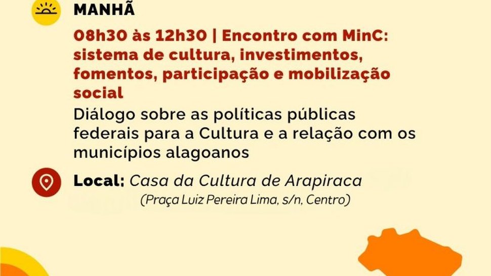 Com o tema “Sistemas de Cultura, investimentos, fomentos, participação e mobilização social”, o momento será de diálogo sobre políticas públicas federais para a cultura e a relação com os municípios alagoanos.