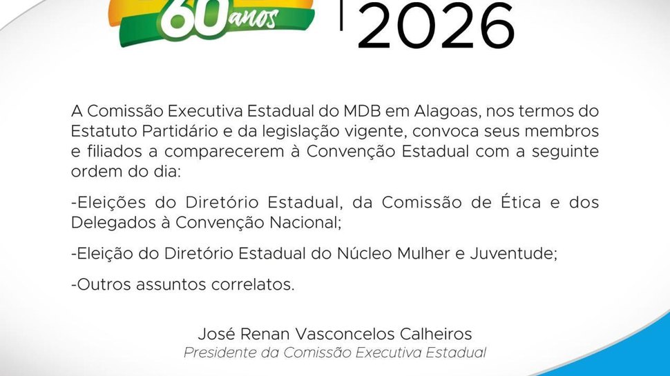 O MDB de Alagoas realiza na próxima segunda-feira, 2, sua convenção estadual. O evento acontece na sede do partido, localizada na Rua Paulina Maria de Mendonça, 816, no bairro da Jatiúca, das 9 às 15 horas. O edital de convocação dos membros e filiados foi publicado pelo senador Renan Calheiros, presidente da Comissão Executiva Estadual do partido. A convocação ocorre nos termos do Estatuto Partidário e da legislação eleitoral vigente.