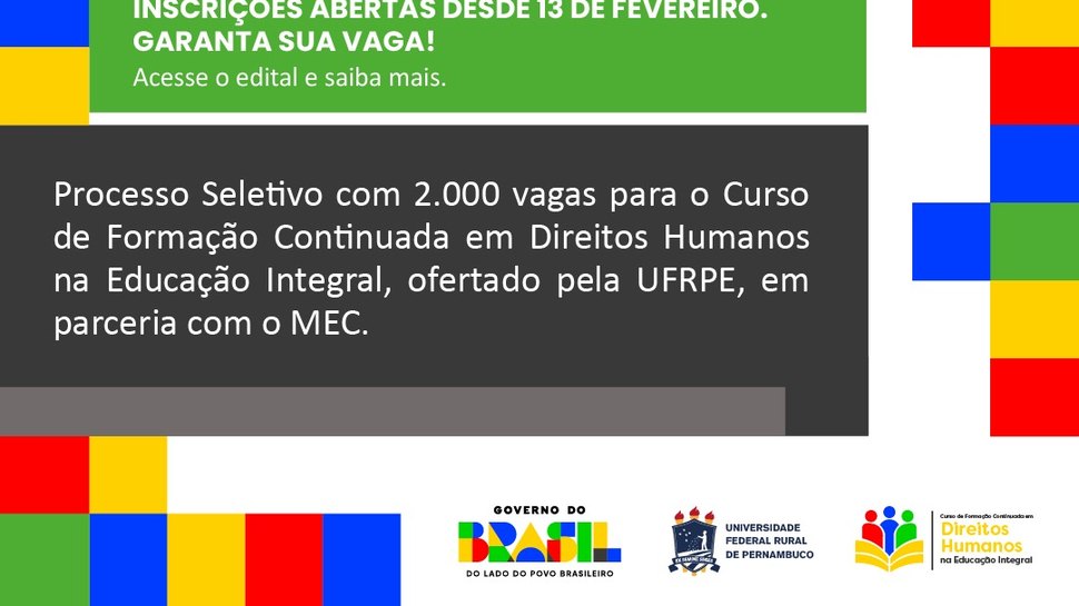 O Ministério da Educação (MEC), por meio da Secretaria de Educação Continuada, Alfabetização, Diversidade e Inclusão (SECADI), está com inscrições abertas para o Curso de Formação Continuada em Direitos Humanos na Educação Integral, ofertado nacionalmente em parceria com a Universidade Federal Rural de Pernambuco (UFRPE). A iniciativa disponibiliza 2.000 vagas gratuitas para profissionais da educação das redes públicas estaduais e municipais de todo o país.