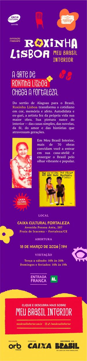 Autodidata e uma das vozes mais singulares da arte popular contemporânea, Roxinha transforma o cotidiano em cor, memória e afeto. Em "Meu Brasil Interior", o público é convidado a conhecer sua casa-ateliê simbólica e a enxergar o Brasil a partir de um olhar vibrante, íntimo e popular.
