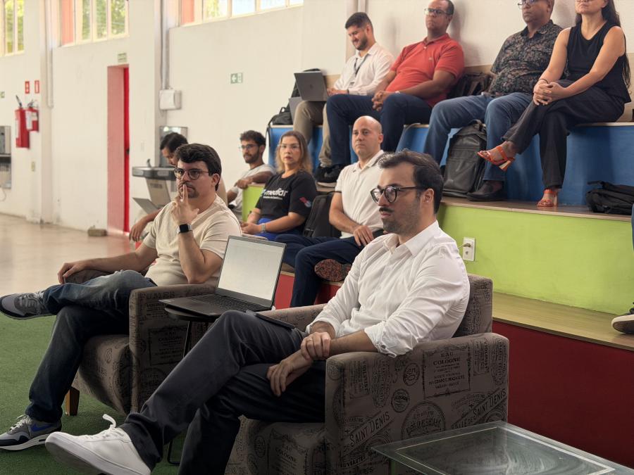 As apresentações foram feitas em um formato dinâmico com 5 minutos de pitch e 7 minutos de perguntas com a banca avaliadora, composta por três avaliadores por equipe.