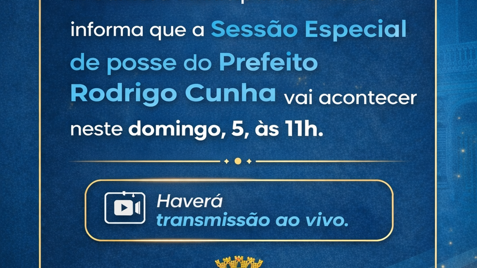 A solenidade está marcada para este domingo (5), às 11h, no Plenário da Casa Legislativa, e oficializa a posse de Rodrigo Cunha como chefe do Executivo Municipal, garantindo a continuidade administrativa conforme prevê a legislação.