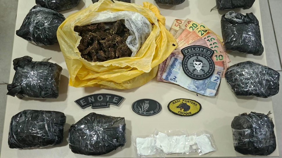 Parte do material foi encontrada durante busca pessoal, incluindo a quantia de R$ 352. O restante do material foi encontrado na busca veicular, no interior do porta-malas., O caso foi encaminhado à Polícia Civil no Centro Integrado de Segurança Pública (Cisp) de Penedo para a adoção das medidas cabíveis.