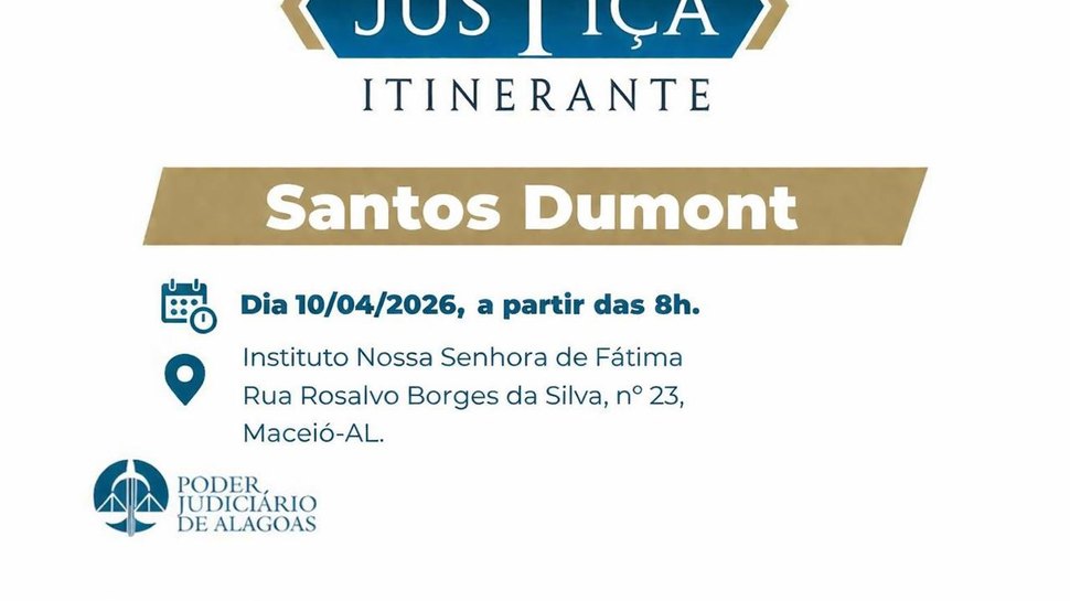 O programa Justiça Itinerante levará, nesta sexta-feira (10), serviços gratuitos aos moradores do bairro Santos Dumont. A iniciativa, promovida pelo Tribunal de Justiça de Alagoas (TJAL) em parceria com outras instituições, terá início às 8h, no Instituto Nossa Senhora de Fátima, localizado à Rua Rosalvo Borges da Silva, nº 23.