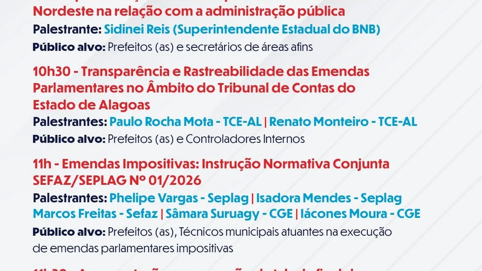 Às 11h, o destaque será a apresentação da Instrução Normativa Conjunta SEFAZ/SEPLAG nº 01/2026, que trata das emendas impositivas. O painel contará com a participação de representantes da Seplag, Sefaz e CGE. A discussão será direcionada a técnicos municipais que atuam na execução de emendas parlamentares impositivas, além de prefeitos.