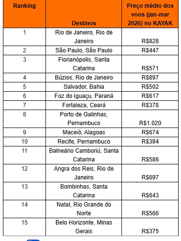 Confira os 15 destinos brasileiros mais buscados por turistas estrangeiros no KAYAK para voos de ida e volta, em classe econômica, entre janeiro e março de 2026: