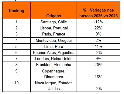 Entre janeiro e março de 2026, cidades da América do Sul e da Europa concentraram as maiores buscas por voos com destino ao Brasil, segundo o estudo do KAYAK. Lisboa lidera o crescimento nas buscas, com aumento de 22% em relação ao mesmo período de 2025, seguida por Frankfurt (+20%) e Copenhague (+18%), indicando um interesse crescente de viajantes europeus pelo Brasil durante a temporada de verão.