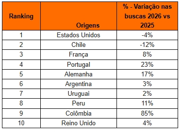 A predominância de América do Sul e Europa nas buscas por voos se reflete também na análise de países de origem com mais buscas entre janeiro e março deste ano. Ainda assim, quem ocupa o topo da lista são os Estados Unidos, que, apesar de uma leve queda de 4% nas buscas em relação ao mesmo período de 2025, lidera a demanda internacional pelo Brasil no início de 2026.