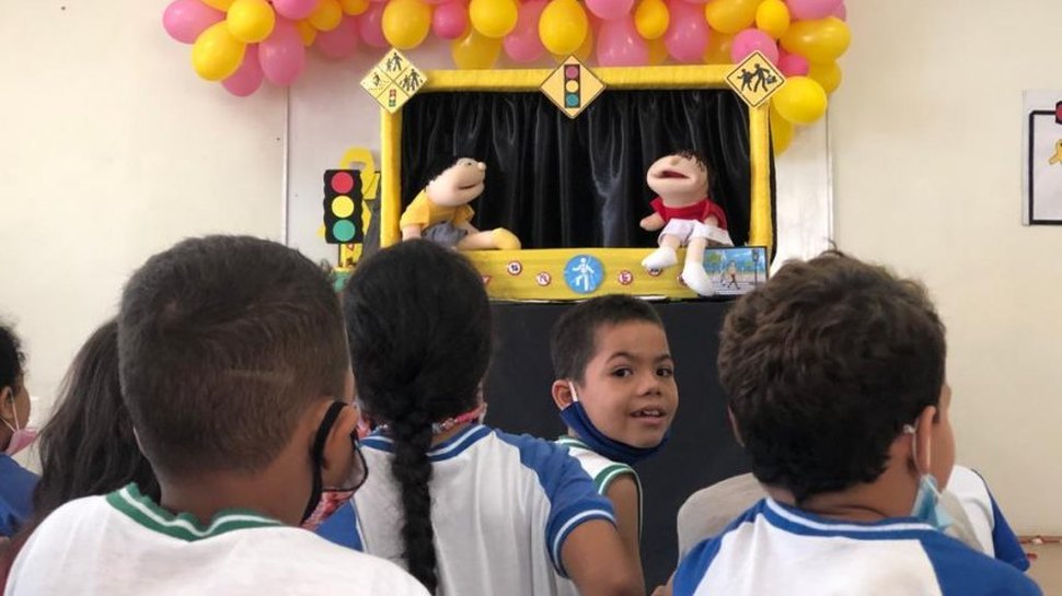 Dando seguimento às atividades, a turma foi dividida. Um grupo seguiu para o bloco do Núcleo de Operações Integradas (NOI), enquanto outros alunos participaram de jogos e seguiram para o circuito de trânsito com bicicletas e jogos. Após o final da "rota" pela SMTT, os estudantes se reuniram na escolinha e assistiram a um vídeo educativo e também ao teatro de fantoches.