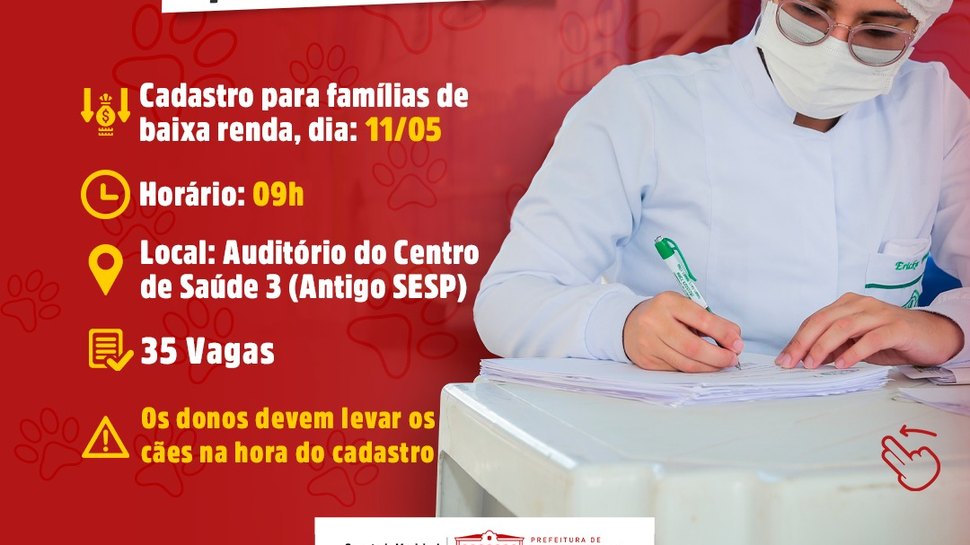 A castração é gratuita e acontece no próximo dia 24 para as famílias de baixa renda. Serão castrados pets fêmea e macho, mas somente um animal por família.