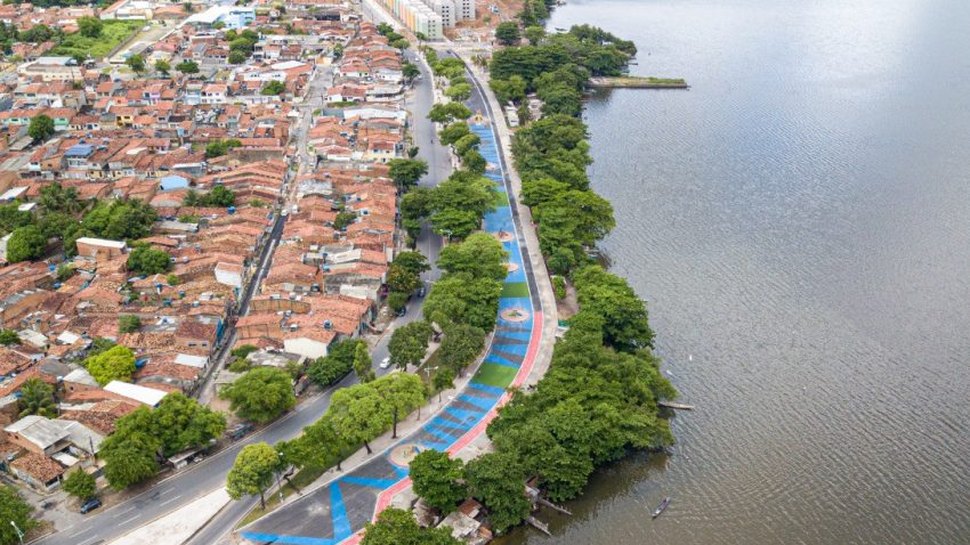 É o que acontece atualmente na orla da Lagoa Mundaú, no Vergel do Lago, na “Rua Aberta”. O asfalto do trecho de avenida que foi interditado para o trânsito está recebendo cores para integrar o piso anteriormente cinza ao verde das árvores e do gramado do canteiro central e às demais cores da paleta natural já presente no ambiente.