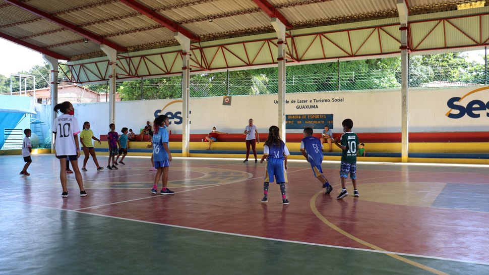 Nesta segunda-feira (11), as atividades foram voltadas para crianças de 7 a 12 anos e tinham como objetivo mostrar aos pequenos algumas brincadeiras populares, incentivando-os a participar delas. Na quadra poliesportiva do Sesc Guaxuma, as crianças brincaram de rouba-bandeira e queimado.