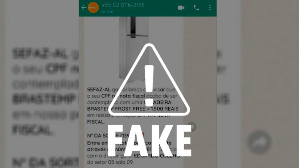 A conta utilizada para o envio da mensagem tem uma imagem de fundo laranja com o nome SEFAZ e DDD 82. "SEFAZ-AL gostaríamos de avisar que o seu CPF na nota fiscal acaba de ser contemplado com uma GELADEIRA BRASTEMP FROST FREE+ 1.500 REAIS em nossa promoção CPF NA NOTA FISCAL”, diz o texto acompanhado de uma imagem ilustrativa da geladeira.